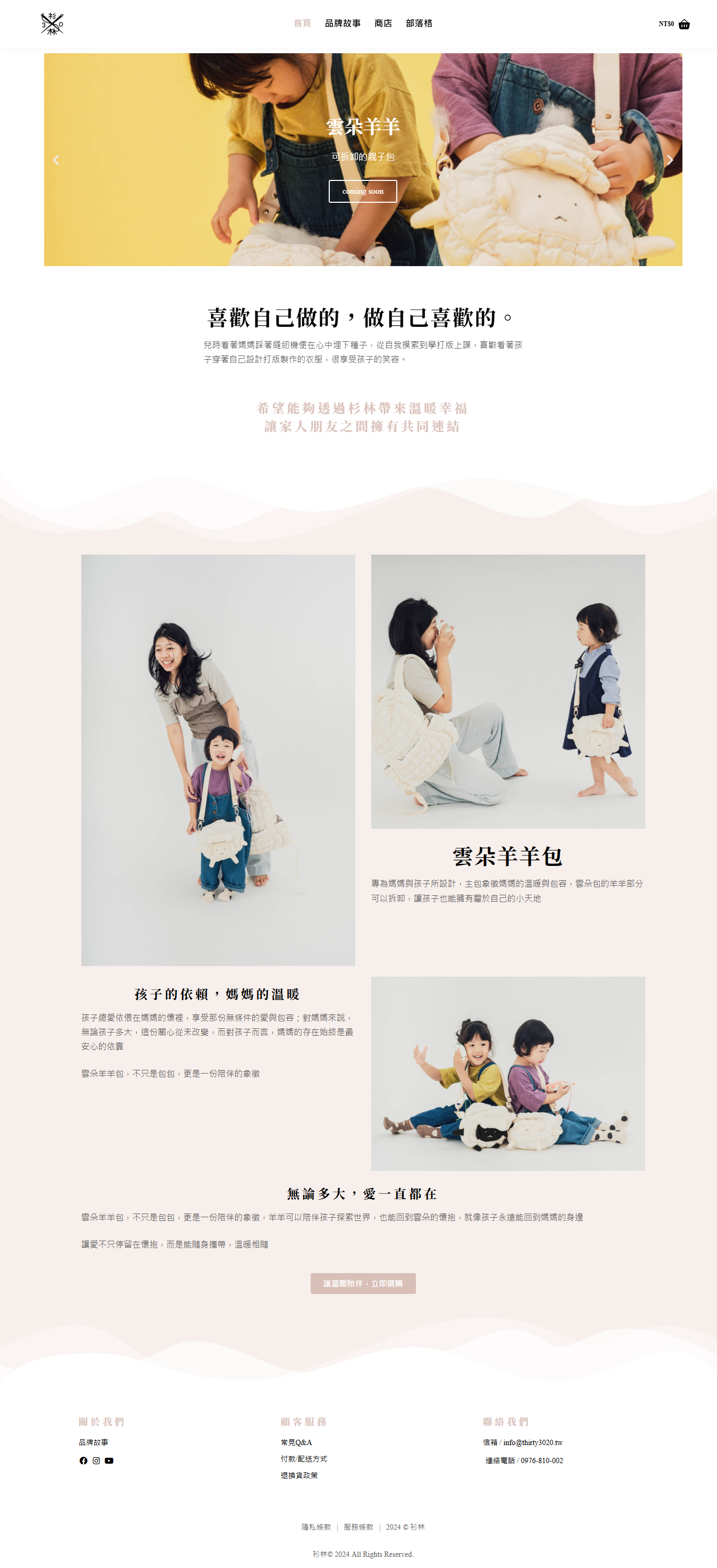 品牌手作家因兒時看著媽媽踩著縫紉機便在心中埋下種子,並開始自己摸索到學打版上課,喜歡看著孩子穿著自己設計打版製作的衣服,很享受孩子的笑容。希望能夠透過杉林帶來溫暖幸福讓家人朋友之間擁有共同連結,整體網站呈現一種溫暖舒適的感覺。
